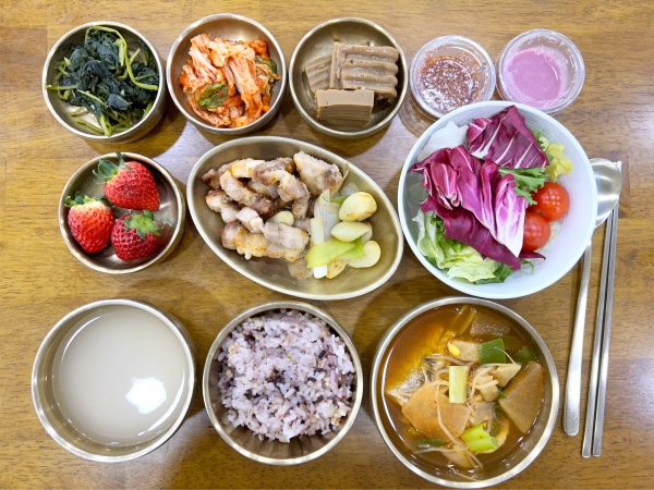 잡곡밥/ 누룽지/ 얼큰동태탕/ 삼겹살구이/