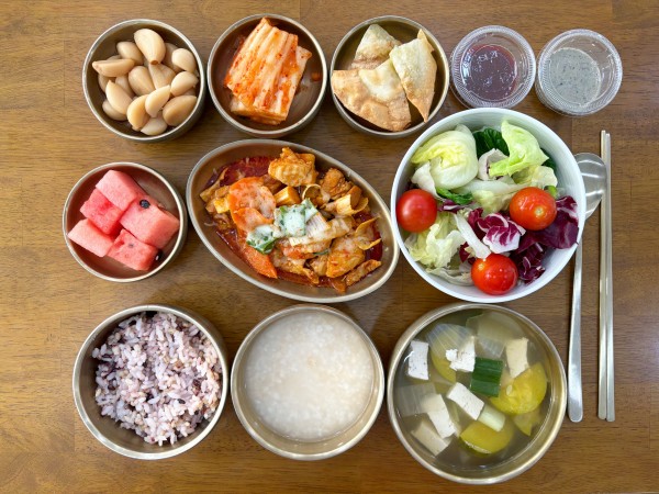 알마늘장아찌/ 김치/ 계절샐러드/ 수박