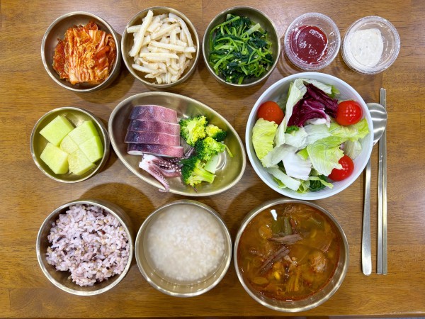 참나물무침/ 김치/ 계절샐러드/ 메론