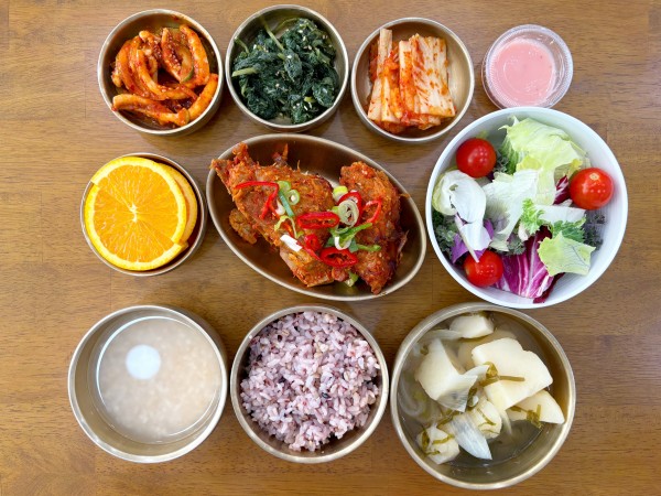 깻잎순나물/ 김치/ 계절샐러드/ 오렌지