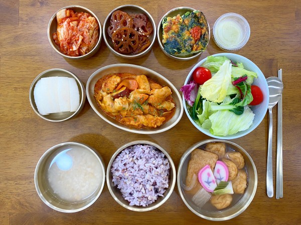 연근조림/ 김치/ 계절샐러드/ 배