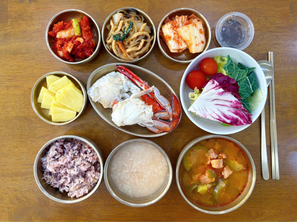 잡곡밥/ 누룽지/ 애호박찌개/ 꽃게찜/