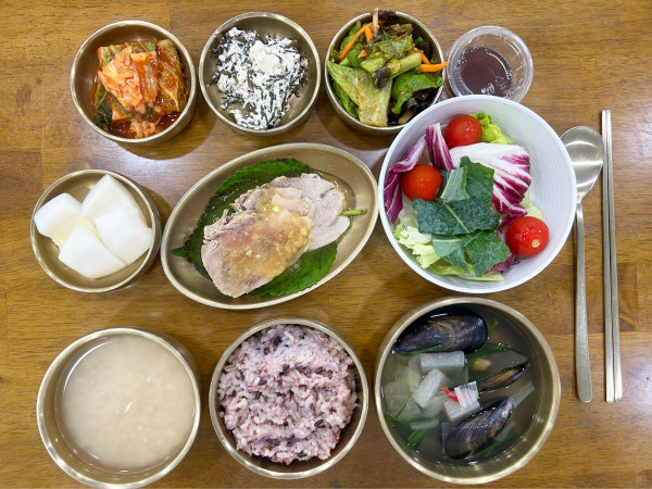 잡곡밥/ 누룽지/ 홍합탕/ 마늘수육/