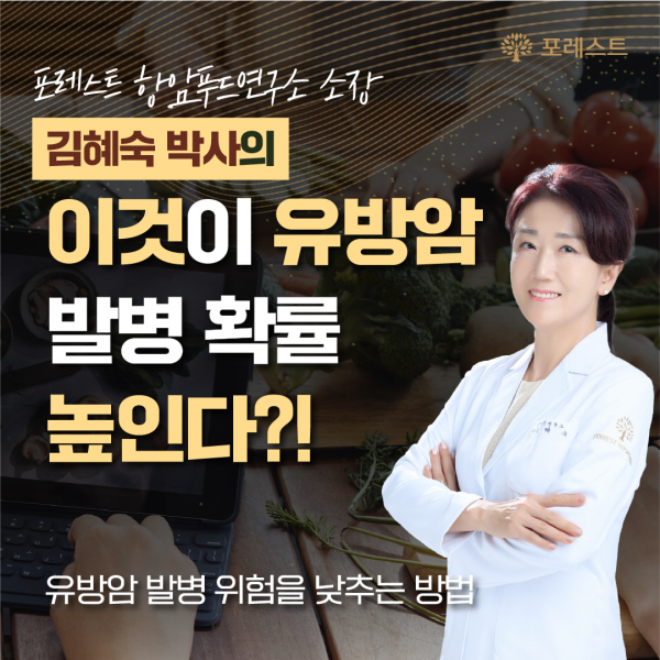 [ 포레스트 강연 : 이것이 유방암 발병 확률 높인다?! ] 340https://www.youtube.com/watch?v=AfU-W-ImGQ8&t=200s 안녕하세요 포레스트입니다! 세계적으로 발병률이 높은 유방암, 혹시 나도 모르게 위험을 키우고 있는 건 아닐까요? 이번 영상에서는 유방암의 주요 위험 인자들에 대해 자세히 설명하고, 건강한 생활 습관을 통해 유방암의 위험을 줄이는 방법을 자세히 소개합니다. 건강한 삶을 유지하기 위해 필요한 정보들을 꼼꼼히 확인해보세요. 포레스트는 환우분들과 함께 건강한 미래를 만들어 나가겠습니다! 목록