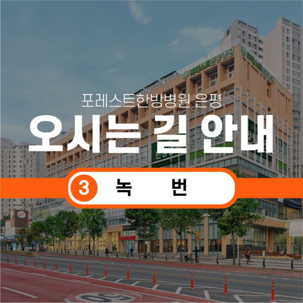 포레스트한방병원 은평 오시는 길(지하철 이용) 555https://www.youtube.com/watch?v=dNw_wPtWGkY 안녕하세요 포레스트한방병원입니다 :D 포레스트한방병원 은평 오시는길 영상이 제작되었습니다~ 3호선 녹번역(1번 출구)에서 도보 5분 거리이며 주차장도 넓기 때문에, 도보, 대중교통, 자차 모두 편하게 오실 수 있습니다. 지하철 이용하여 오시는 방법은 영상과 함께 쉽고 편하게 방문해주시길 바랍니다. :) ▶ 서울특별시 은평구 통일로 636 4층, 5층 언제나 환자치료에 최선을 다하는 "병원다운 병원"이 되겠습니다. 감사드리고 사랑합니다♥ 목록