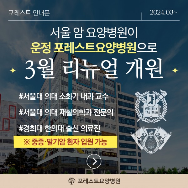 포레스트요양병원 운정 리뉴얼 개원소식(3월) 기존 서울암요양병원이 3월 "포레스트요양병원 운정점"으로 리뉴얼 개원합니다~ 서울대 의대 소화기 내과교수, 서울대 의대 암재활 및 재활의학과 전문의와 더불어 경희대 한의대 출신의 쟁쟁한 의료진이 포레스트와 협력하며 강력한 시너지 효과가 기대되는데요~ 중증, 말기암 환우분들도 입원이 가능하오니 환우분들의 많은 관심과 문의 부탁드립니다! 앞으로도 사회 공헌에 이바지하는 포레스트가 되겠습니다 감사합니다 :)♡ 목록