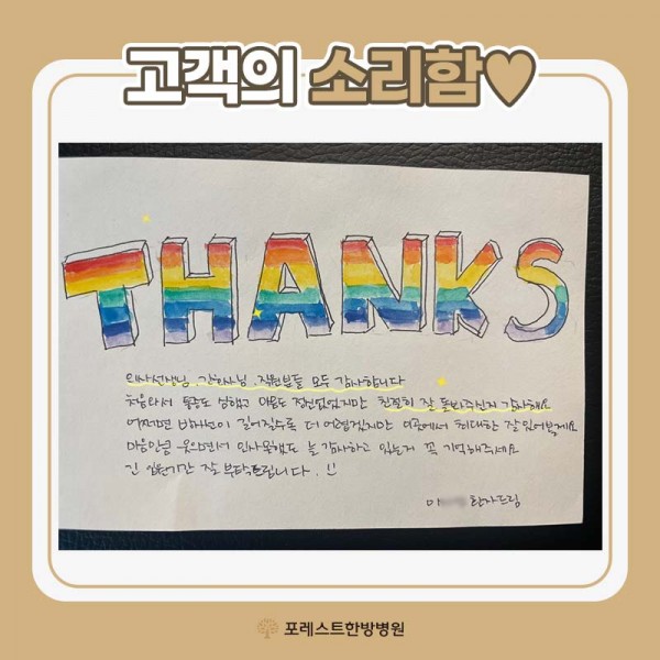 고객의 소리함 고객의 소리함 THANKS 글씨 속에 담긴 알록달록 무지개 색깔처럼 저희 마음에도 무지개가 피어날 것 같은 정성 가득한 편지를 받았습니다. :) 저희 포레스트한방병원과 함께 하시는 시간이 더 행복하실 수 있도록 늘 환우분들의 치료에 최선을 다하는 포레스트한방병원이 되겠습니다. 감사합니다. 목록
