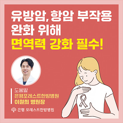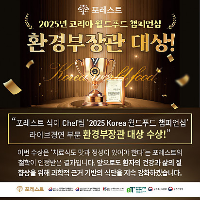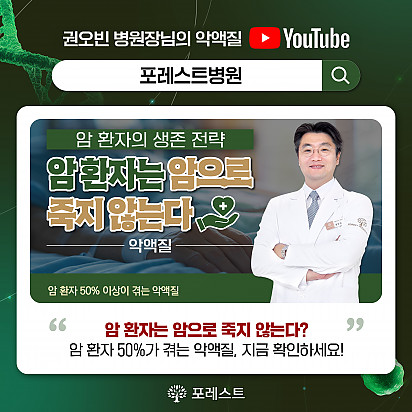 자궁내막암 3기, 박지혜 환우님의 희망일지 ep_1 | 포레스트 환우 이야기 2024.08.08 자궁내막암 3기, 박지혜 환우님의 희망일지 ep_2 | 포레스트 환우 이야기 2024.08.08 자궁내막암 3기, 박지혜 환우님의 희망일지 ep_3 | 포레스트 환우 이야기 2024.08.08 폐암 4기(비소세포암), 서중원 환우님의 희망일지 ep_1 | 포레스트 환우 이야기 2024.08.08 폐암 4기(비소세포암), 서중원 환우님의 희망일지 ep_2 | 포레스트 환우 이야기 2024.08.08 폐암 4기(비소세포암), 서중원 환우님의 희망일지 ep_3 | 포레스트 환우 이야기 2024.08.08 Hot 포레스트의 항암식이Chef팀을 소개합니다. 시즌1에 이어서 큰 이슈가 되고 있는 흑백요리사 시즌2 다들 시청 중이신가요? 포레스트에도 특급호텔, 미슐랭 2스타 출신 등… 2025.12.31 Hot 2026년, 새해 복 많이 받으세요! 지난 한 해 동안 포레스트와 회복의 여정을 함께해 주셔서 진심으로 감사드립니다 2026년 병오년, 붉은 … 2025.12.30 Hot 포레스트 크리스마스 면역 식탁 여러분, 크리스마스는 따뜻하게 보내셨나요? 12월 25일, 포레스트에서는환우분들의 건강과 회복을 응원하는풍성한 크리스… 2025.12.26 Hot [건강정보] 두통에 도움되는 간단한 지압법 소개드립니다. 안녕하세요, 포레스트입니다! ???? 오늘은 두통에 자주 시달리시는 분들을 위해 하루 1분! 가벼운 두통이 있을 때 하면 … 2025.12.10 Hot 은평 포레스트 리뉴얼 완료! 은평 포레스트한방병원이 오랫동안 준비해온 공간 리뉴얼을 마쳤습니다. ※ 새로워진 공간 - 55병상 재구… 2025.12.08 Hot [건강정보]독감, 감기와 달라요! 감기와 독감, 비슷해 보여도 원인·증상·진행 속도 모두 다르다는 사실 알고 계셨나요? 이번 영상에서는 두 질환의 차이를 딱 … 2025.11.25 Hot 암 환자의 절반 이상이 겪는 숨은 적, ‘악액질’ 암 환자의 절반 이상이 겪는 숨은 적, ‘악액질’. 단순히 살이 빠지는 문제가 아니라, 근육이 소모되고 체력이 급격히 떨어지… 2025.11.13 Hot 유방암 항암 부작용 완화, 핵심은 ‘면역력’입니다. 이번 카드뉴스에서는 은평 포레스트 이철희 병원장님이 전하는 ‘유방암 치료 후 회복을 위한 면역 관리법’을 쉽… 2025.11.06 Hot 포레스트 항암식이팀, 2025 코리아 월드푸드 챔피언십 환경부장관상(대상) 수상! 두구두구두구 포레스트 식이 Chef팀이 2025 Korea World Food Championship 라이브경연 부문에서… 2025.11.04 12345 Search 검색대상 제목 내용 제목+내용 회원아이디 회원아이디(코) 글쓴이 글쓴이(코) 검색어 필수