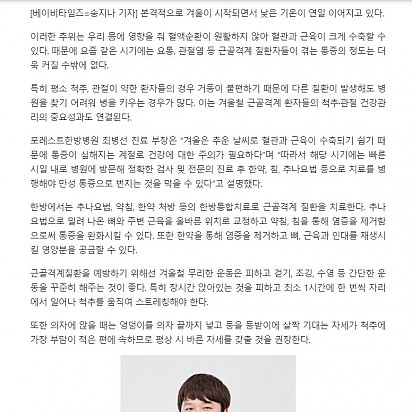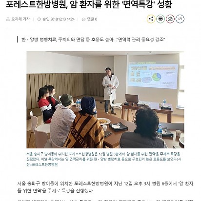 자궁내막암 3기, 박지혜 환우님의 희망일지 ep_1 | 포레스트 환우 이야기 2024.08.08 자궁내막암 3기, 박지혜 환우님의 희망일지 ep_2 | 포레스트 환우 이야기 2024.08.08 자궁내막암 3기, 박지혜 환우님의 희망일지 ep_3 | 포레스트 환우 이야기 2024.08.08 폐암 4기(비소세포암), 서중원 환우님의 희망일지 ep_1 | 포레스트 환우 이야기 2024.08.08 폐암 4기(비소세포암), 서중원 환우님의 희망일지 ep_2 | 포레스트 환우 이야기 2024.08.08 폐암 4기(비소세포암), 서중원 환우님의 희망일지 ep_3 | 포레스트 환우 이야기 2024.08.08 Hot [산업일보]허리 ‘찌릿’하다면, 바로 병원 가야하는 신호 평소 앉아서 업무를 하는 사무직은 잘못된 자세와 습관으로 인해 허리 통증을 느낄 때가 많다. 소위 ‘디스크’라고 알려진 추간판… 2021.05.18 Hot [폴리뉴스]유상철 감독도 걸린 생존율 11% ‘췌장암’, 해결법은? 2002년 월드컵 4강 신화의 주역 유상철 감독이 얼마 전 췌장암 4기 투병 소식을 전하면서 안타까움을 더했다. 췌장암은 발견… 2021.05.18 Hot [일간투데이]유방암 환자 큰 폭 증가, 無 증상이 무심코 암 키운다 [일간투데이 이성자 기자] 지난 10년 사이 유방암 환자가 의미 있는 수준으로 늘어났다는 언론 보도가 제기됐다. 유방암은 보통… 2021.05.18 Hot [메디컬투데이]관절 긴장 유발하는 겨울철 심해지는 어깨통증 20대 직장인 A씨는 옷을 입으려 손을 뻗었다 찌릿한 어깨 통증에 금세 손을 내렸다. 그는 아직 나이가 젊어 좀 아프다 말겠지… 2021.05.18 Hot [폴리뉴스]겨울철 남자들의 말 못 할 비밀, ‘전립선’ 질환 남성들에게는 겨울은 시련의 계절이다. 날이 추워지면 우리의 몸은 체온 유지를 위해 땀 배출은 줄이고 체내 수분량은 늘리게 된다… 2021.05.18 Hot [Queen]포레스트한방병원, 크리스마스 맞이 입원 환자 대상 이벤트 진행 포레스트한방병원이 크리스마스를 맞아 환자들을 대상으로 특별 이벤트를 진행했다고 24일 밝혔다. 포레스트한방병원은 의료진… 2021.05.18 Hot [메디소비자뉴스]포레스트한방병원, 암 환자를 위한 '면역특강' 성황 -한ㆍ양방 병행치료, 주치의와 면담 등 호응도 높아…"면역력 관리 중요성 강조" 서울 송파구 방이동에 위치한 포레스트한방… 2021.05.18 Hot [베이비타임즈]추위로 인해 ‘찌릿’한 관절 통증, 치료와 예방법은? [베이비타임즈=송지나 기자] 본격적으로 겨울이 시작되면서 낮은 기온이 연일 이어지고 있다. 이러한 추위는 우리 몸에 영향… 2021.05.18 Hot [메디소비자뉴스]한의사ㆍ호텔 셰프 '밥심 합작품'…환자 '약선식단’이 뜬다 체질에 따라 음식에 한약제 배합으로 면역력 향상…맛ㆍ건강 다잡아 불규칙한 식사 습관으로 건강이 나빠 본적 있는가? 건… 2021.05.18 21222324 Search 검색대상 제목 내용 제목+내용 회원아이디 회원아이디(코) 글쓴이 글쓴이(코) 검색어 필수