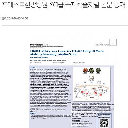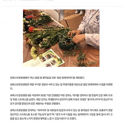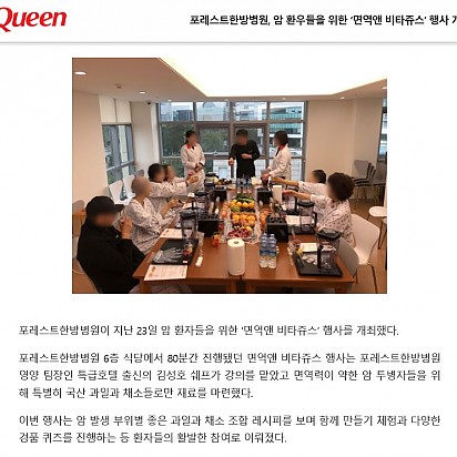 자궁내막암 3기, 박지혜 환우님의 희망일지 ep_1 | 포레스트 환우 이야기 2024.08.08 자궁내막암 3기, 박지혜 환우님의 희망일지 ep_2 | 포레스트 환우 이야기 2024.08.08 자궁내막암 3기, 박지혜 환우님의 희망일지 ep_3 | 포레스트 환우 이야기 2024.08.08 폐암 4기(비소세포암), 서중원 환우님의 희망일지 ep_1 | 포레스트 환우 이야기 2024.08.08 폐암 4기(비소세포암), 서중원 환우님의 희망일지 ep_2 | 포레스트 환우 이야기 2024.08.08 폐암 4기(비소세포암), 서중원 환우님의 희망일지 ep_3 | 포레스트 환우 이야기 2024.08.08 Hot [Queen]포레스트한방병원, 암 환우들을 위한 ‘면역앤 비타쥬스’ 행사 열려 포레스트한방병원이 지난 23일 암 환자들을 위한 ‘면역앤 비타쥬스’행사를 열었다. 포레스트한방병원 6층 식당에서 80분간… 2021.05.18 Hot [일간투데이]본격적인 겨울 추위 시작...효과 만점 감기 예방법은? [일간투데이 이성자 기자] 아침, 저녁으로 제법 쌀쌀한 기운이 맴돌고 있는 요즘 사람들의 옷차림 역시 점점 두꺼워지며 본격적인… 2021.05.18 Hot [헬스경향] 포레스트한방병원, SCI급 국제학술저널 논문 등재 포레스트한방병원이 11일 이대연 병원장, 이인희 연구소장의 공동 연구 논문이 9월 SCI급 국제학술지에 등재됐다고 밝혔다. … 2021.05.18 Hot [이투데이] 포레스트한방병원, SCI급 국제학술저널 논문 등재 이대연 포레스트한방병원 병원장과 이인희 연구소장의 공동 연구 논문 ‘Herbal Medicine FDY003 Inhibits … 2021.05.18 Hot [Queen] 포레스트한방병원, 암 환우들을 위한 '힐링원예테라피'개최 포레스트한방병원이 지난 25일 암 환자들을 위한 ‘힐링 원예테라피’를 개최했다. 포레스트한방병원은 매일 무서운 질병과 싸… 2021.05.18 Hot 추석연휴, 암 환우들이 주의해야 할 식단은? 암환우 추석연휴 식생활 포레스트한방병원 영양팀을 통해 추석 연휴동안 암환자가 주의해야 할 사항에 대해 알아보았습니다. … 2021.05.18 Hot 전라일보,국제뉴스,대학저널,대학신문.-원광보건대학교 임상병리과, 포레스트한방병원과 연구 및 교육협력 MOU 체결 원광보건대학교(총장 백준흠) 임상병리과가 최근 암면역치료를 제공하고 있는 포레스트한방병원과 산학협력 MOU를 체결했다고 6일 … 2021.05.18 Hot [서울 송파] 암 전문 포레스트한방병원에서 고주파온열암치료를 받아보세요 [서울 송파] 암 전문 포레스트한방병원에서 고주파온열암치료를 받아보세요 2021.05.18 Hot <메디컬투데이> 포레스트한방병원, 원광보건대와 연구 활성화 위해 산학 협력 MOU 체결 포레스트한방병원은 지난 20일 원광보건대학교와 연구, 산학 협력 MOU를 체결했다고 21일 밝혔다. 포레스트한방병원과 원… 2021.05.18 21222324 Search 검색대상 제목 내용 제목+내용 회원아이디 회원아이디(코) 글쓴이 글쓴이(코) 검색어 필수