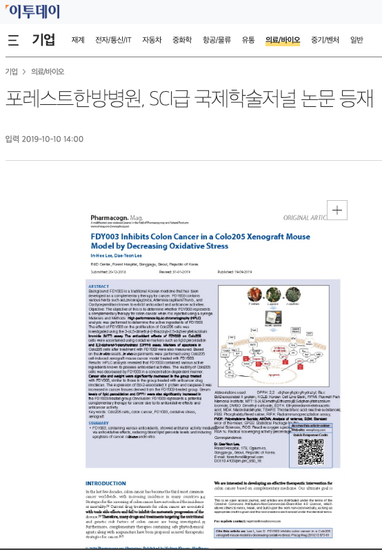 이대연 포레스트한방병원 병원장과 이인희 연구소장의 공동 연구 논문 ‘Herbal Medicine FDY003 Inhibits Colon Cancer in Colo205 Xenograft Mouse Model by Decreasing Oxidative Stress’가 SCI급 국제 학술지(pharmacognosy magazine) 9월호에 등재됐다.