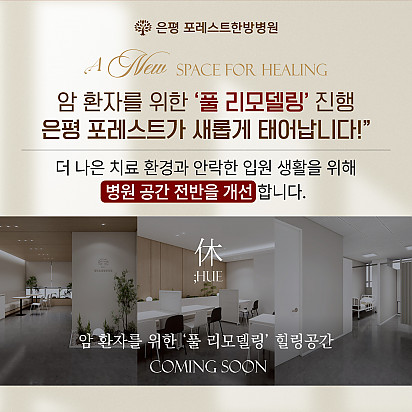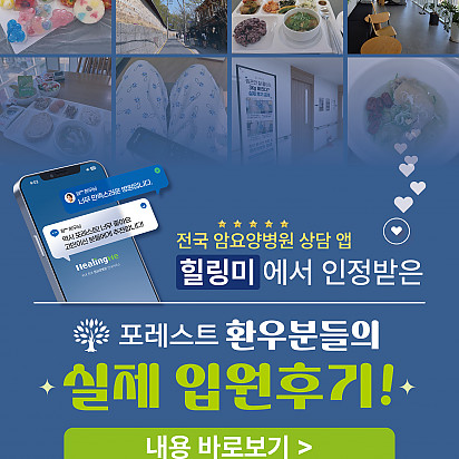 자궁내막암 3기, 박지혜 환우님의 희망일지 ep_1 | 포레스트 환우 이야기 2024.08.08 자궁내막암 3기, 박지혜 환우님의 희망일지 ep_2 | 포레스트 환우 이야기 2024.08.08 자궁내막암 3기, 박지혜 환우님의 희망일지 ep_3 | 포레스트 환우 이야기 2024.08.08 폐암 4기(비소세포암), 서중원 환우님의 희망일지 ep_1 | 포레스트 환우 이야기 2024.08.08 폐암 4기(비소세포암), 서중원 환우님의 희망일지 ep_2 | 포레스트 환우 이야기 2024.08.08 폐암 4기(비소세포암), 서중원 환우님의 희망일지 ep_3 | 포레스트 환우 이야기 2024.08.08 Hot 포레스트의 악액질(Cachexia) 검사와 치료 암 진단을 받고 항암치료 중이거나 수술 후 요양 중이신 분들이라면 잘 먹어도 갑자기 몸무게가 확 빠지는 경험이 있… 2025.10.30 Hot [암환자를 위한 운동 채널] 소개합니다! “영상으로 함께 회복을 시작하세요!” 원내에서도, 집에서도 안전하게 따라할 수 있는 [암환자를 위한 운동 채널]… 2025.10.27 Hot 은평 포레스트 리모델링 소식 은평 포레스트가 환자분들의 치료와 회복에 최적화된 공간으로 새로워집니다. Coming Soon … 2025.10.20 Hot 자연이 주는 보약, 제철 식단 자연이 주는 보약, 제철 식단 가을에 나는 음식은 가을에 먹어야 합니다. 가장 영양이 풍부한 제철 식재료로 몸… 2025.10.10 Hot 힐링미 앱의 은평 포레스트 입원 환우 후기 전국 암요양병원 상담 앱 힐링미에서 인정받은 포레스트 입원 환우 후기 포레스트는 환자 한 분, 한 분의 이야기에 귀 기… 2025.10.02 Hot 포레스트 10월 휴진 안내 안녕하세요, 포레스트입니다. 다가오는 10월 은평점 휴진 일정을 미리 알려드리오니 내원과 예약에 참고하시길 바랍니다. 언… 2025.09.22 Hot 작은 감기도 크게 번질 수 있는 암 환자의 환절기 건강수칙 작은 감기도 크게 번질 수 있는 암 환자의 환절기 건강수칙 환절기에는 큰 일교차와 건조한 공기로 호흡기 질환이 늘어나… 2025.09.17 Hot 포레스트 힐링 운동 프로그램 포레스트는 환우분들의 건강한 일상을 위해 운동 프로그램을 운영하고있습니다. ✅ 왜 운동이 필요할까요? 항암 치료 과정에… 2025.09.09 Hot [뇌종양 환자를 위한 운동법] 기억력 감소, 브레인포그. 이거 하나면 충분합니다. 두통, 어지럼증, 불안… 뇌종양 환자라면 매일 마주하는 어려움이죠. 은평 포레스트한방병원 이철희병원장님의 단 5분, 간… 2025.09.05 12345 Search 검색대상 제목 내용 제목+내용 회원아이디 회원아이디(코) 글쓴이 글쓴이(코) 검색어 필수