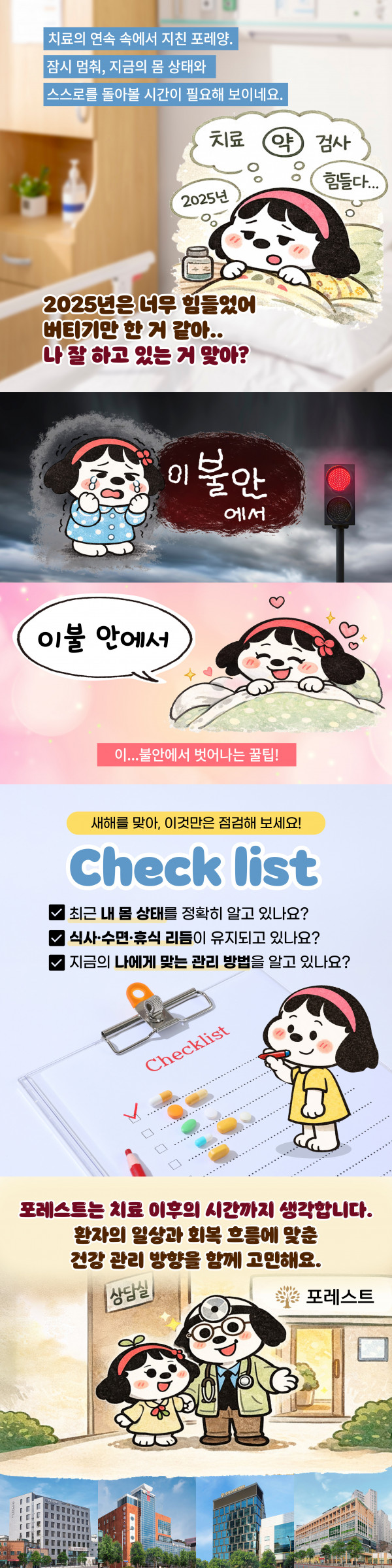 새해의 건강계획 세우셨나요? 치료의 연속 속에서 잠깐 멈춤 새해를 맞아 지금의 나, 지금의 몸을 살짝 체크해볼 시간이에요 포레스트가 차근차근 알려드릴게요 ────────────────── ✅ 문의 전화 : 포레스트 1899-5868 ✅ 홈페이지 : foresthospital.co.kr ✅ 유튜브 : ‘포레스트병원’ 검색 ────────────────── 목록