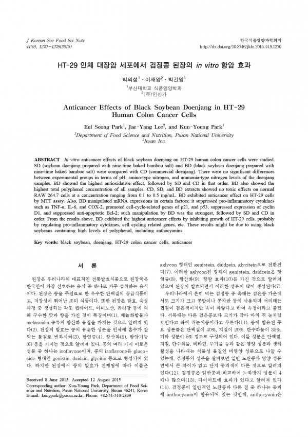 HT-29 인체 대장암 세포에서 검정콩 된장의 in vitro 항암 효과 2025.03.27 17:55 268https://scienceon.kisti.re.kr/commons/util/originalView.do?cn=JAKO2015… HT-29 인체 대장암 세포에서 검정콩 된장의 in vitro 항암 효과 https://scienceon.kisti.re.kr/commons/util/originalView.do?cn=JAKO201528559178212&dbt=JAKO&koi=KISTI1.1003%2FJNL.JAKO201528559178212 목록