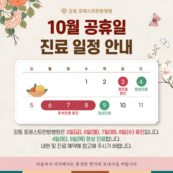 포레스트 10월 휴진 안내 안녕하세요, 포레스트입니다. 다가오는 10월 강동점 휴진 일정을 미리 알려드리오니 내원과 예약에 참고하시길 바랍니다. 언제나 믿고 찾아주시는 마음에 감사드리며, 더 정성스러운 진료로 보답하겠습니다. ✅ 문의 : 1899-5868 ✅ 홈페이지 : foresthospital.co.kr ✅ 유튜브 : ‘포레스트병원’ 검색 목록