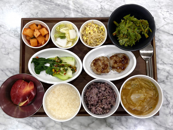 닭죽/ 잡곡밥/ 배추된장국/ 수제떡갈비구이/
