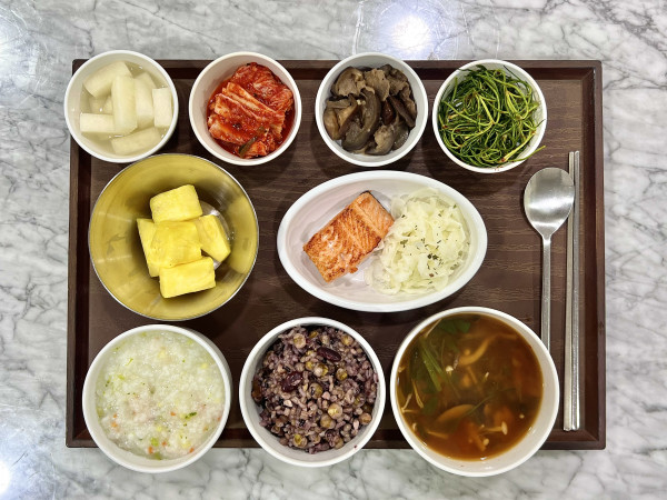 야채죽/잡곡밥/녹진버섯전골/연어스테이크/