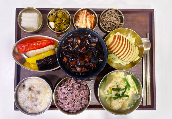 잡곡밥/바지락죽/쪽파계란탕/고기짜장/