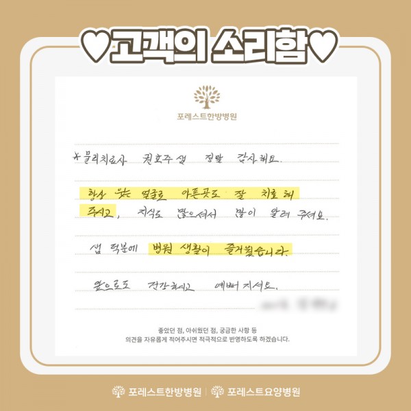 이번달 포레스트한방병원 강동, 포레스요양병원 강남, 포레스트한방병원 대구점의 전달 된 고객의소리함 모음zip입니다.