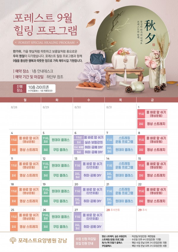 9월 힐링프로그램 포레스트의 9월 힐링프로그램을 소개합니다. 포레스트한방병원, 요양병원은 매달 환우분들의 힐링을 위하여 운동, DIY수업, 쿠킹클래스 등의 프로그램을 진행하고 있습니다. 환우분들께서 포레스트에 계시는 시간들이 더욱 힐링으로 느껴지실수 있도록 더욱 재밌고 유익한 프로그램들을 준비하도록 하겠습니다. 포레스트힐링프로그램과 함께 더욱 행복이 풍성한 9월이 되시길 기원합니다. ❤ 목록