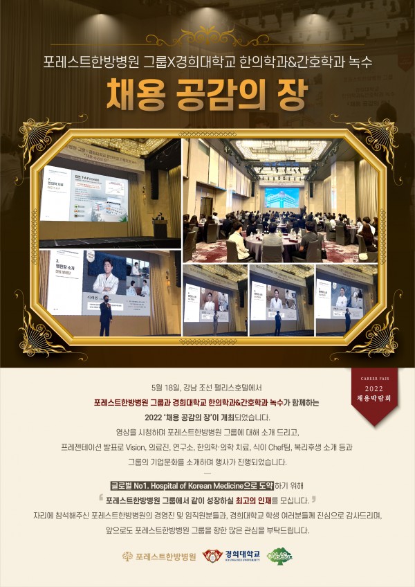 포레스트한방병원 그룹과 경희대학교 한의학과&간호학과 녹수가 함께하는 2022 ‘채용 공감의 장’이 개최되었습니다.