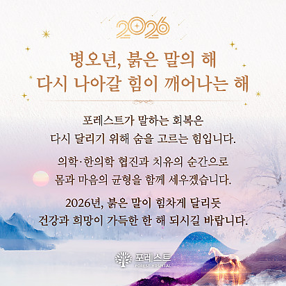 Hot 포레스트의 항암식이Chef팀을 소개합니다. 시즌1에 이어서 큰 이슈가 되고 있는 흑백요리사 시즌2 다들 시청 중이신가요? 포레스트에도 특급호텔, 미슐랭 2스타 출신 등… 2025.12.31 Hot 2026년, 새해 복 많이 받으세요! 지난 한 해 동안 포레스트와 회복의 여정을 함께해 주셔서 진심으로 감사드립니다 2026년 병오년, 붉은 … 2025.12.30 Hot 포레스트 크리스마스 면역 식탁 여러분, 크리스마스는 따뜻하게 보내셨나요? 12월 25일, 포레스트에서는환우분들의 건강과 회복을 응원하는풍성한 크리스… 2025.12.26 Hot [건강정보] 두통에 도움되는 간단한 지압법 소개드립니다. 안녕하세요, 포레스트입니다! ????오늘은 두통에 자주 시달리시는 분들을 위해하루 1분! 가벼운 두통이 있을 때 하면 좋을 지… 2025.12.10 Hot [건강정보]독감, 감기와 달라요! 감기와 독감, 비슷해 보여도 원인·증상·진행 속도 모두 다르다는 사실 알고 계셨나요? 이번 영상에서는 두 질환의 … 2025.11.25 Hot 암환우 힐링 프로그램 ‘속닥속닥 캠프’ OPEN! 한국암재활협회 × 포레스트 암환우 힐링 프로그램 ‘속닥속닥 캠프’ OPEN! 암 치료 과정에서 지친 마음을 회복… 2025.11.21 Hot 강남 포레스트 ‘낭독 다독임 클래스’ 따뜻한 현장 후기 강남 포레스트요양병원의 힐링 프로그램 중 많은 분들의 사랑을 받고 있는 ‘낭독 다독임 클래스’ 따뜻한 현장 후기를 소개드립… 2025.11.18 Hot 암 환자의 절반 이상이 겪는 숨은 적, ‘악액질’ 암 환자의 절반 이상이 겪는 숨은 적, ‘악액질’. 단순히 살이 빠지는 문제가 아니라, 근육이 소모되고 체력이 급격히 떨어지… 2025.11.13 Hot 강남점 낭독프로그램 작가 소개 강남 포레스트요양병원에서는 마음의 쉼표를 만드는 낭독 다독임 클래스가 진행 중입니다. 오늘은 함께해주시는 **낭독 작가 ‘… 2025.11.12 12345 Search 검색대상 제목 내용 제목+내용 회원아이디 회원아이디(코) 글쓴이 글쓴이(코) 검색어 필수