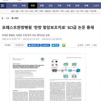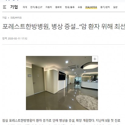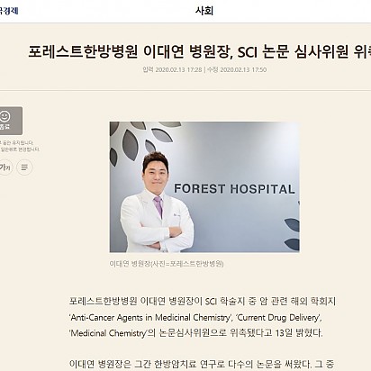 Hot [뉴스1]포레스트한방병원 ‘한방 항암보조치료’ SCI급 논문 등재 이대연 병원장, 사물탕 조혈·면역 기능 메커니즘 규명 포레스트한방병원 이대연 병원장이 사물탕의 조혈, 면역 기능 메커니즘에 … 2021.05.18 Hot [일간투데이]샛노란 얼굴의 췌장암 말기, 이미 늦었나요? [일간투데이 양보형 기자] 60대 남성 A씨는 양치질을 하며 거울에 비친 샛노란 얼굴에 건강을 걱정하기 시작했다. 요즘 종종 … 2021.05.18 Hot [한국경제] 포레스트한방병원 이대연 병원장, SCI 논문 심사위원 위촉 포레스트한방병원 이대연 병원장이 SCI 학술지 중 암 관련 해외 학회지 ‘Anti-Cancer Agents in Medicin… 2021.05.18 Hot [이투데이]포레스트한방병원, 병상 증설...“암 환자 위해 최선 다해 진료하겠다” 잠실 포레스트한방병원이 환자 증가로 인해 병상을 증설, 확장 개원했다. 지난해 5월 첫 진료를 시작한 이후 8개월 만에 병상 … 2021.05.18 Hot [오가닉라이프신문] 포레스트한방병원, 힐링프로그램 운영 포레스트한방병원이 운영하고 있는 ‘힐링프로그램’이 환자들을 대상으로 높은 호응을 얻고 있다. 포레스트한방병원의 힐링프로그… 2021.05.18 Hot [산업일보]허리 ‘찌릿’하다면, 바로 병원 가야하는 신호 평소 앉아서 업무를 하는 사무직은 잘못된 자세와 습관으로 인해 허리 통증을 느낄 때가 많다. 소위 ‘디스크’라고 알려진 추간판… 2021.05.18 Hot [폴리뉴스]유상철 감독도 걸린 생존율 11% ‘췌장암’, 해결법은? 2002년 월드컵 4강 신화의 주역 유상철 감독이 얼마 전 췌장암 4기 투병 소식을 전하면서 안타까움을 더했다. 췌장암은 발견… 2021.05.18 Hot [일간투데이]유방암 환자 큰 폭 증가, 無 증상이 무심코 암 키운다 [일간투데이 이성자 기자] 지난 10년 사이 유방암 환자가 의미 있는 수준으로 늘어났다는 언론 보도가 제기됐다. 유방암은 보통… 2021.05.18 Hot [메디컬투데이]관절 긴장 유발하는 겨울철 심해지는 어깨통증 20대 직장인 A씨는 옷을 입으려 손을 뻗었다 찌릿한 어깨 통증에 금세 손을 내렸다. 그는 아직 나이가 젊어 좀 아프다 말겠지… 2021.05.18 2122232425 Search 검색대상 제목 내용 제목+내용 회원아이디 회원아이디(코) 글쓴이 글쓴이(코) 검색어 필수