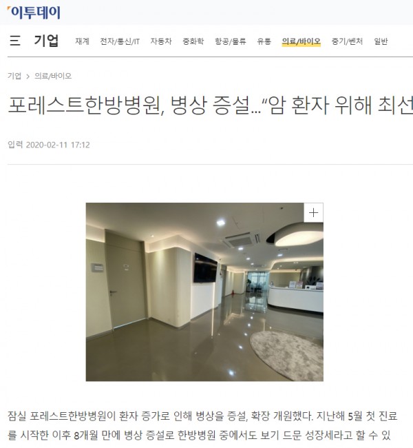 [이투데이]포레스트한방병원, 병상 증설...“암 환자 위해 최선 다해 진료하겠다”