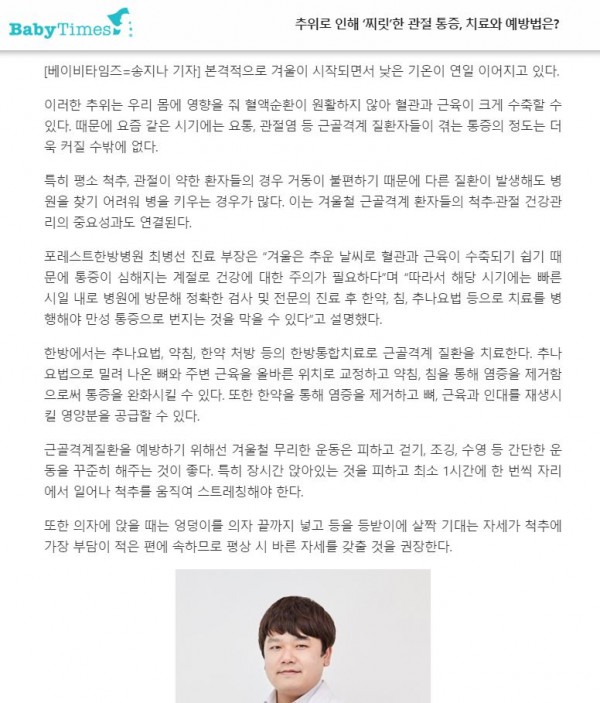 포레스트한방병원 최병선 진료 부장은 “겨울은 추운 날씨로 혈관과 근육이 수축되기 쉽기 때문에 통증이 심해지는 계절로 건강에 대한 주의가 필요하다”며 “따라서 해당 시기에는 빠른 시일 내로 병원에 방문해 정확한 검사 및 전문의 진료 후 한약, 침, 추나요법 등으로 치료를 병행해야 만성 통증으로 번지는 것을 막을 수 있다”고 설명했다.
