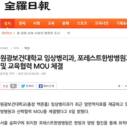Hot [Queen] 포레스트한방병원, 암 환우들을 위한 '힐링원예테라피'개최 포레스트한방병원이 지난 25일 암 환자들을 위한 ‘힐링 원예테라피’를 개최했다. 포레스트한방병원은 매일 무서운 질병과 싸… 2021.05.18 Hot 추석연휴, 암 환우들이 주의해야 할 식단은? 암환우 추석연휴 식생활 포레스트한방병원 영양팀을 통해 추석 연휴동안 암환자가 주의해야 할 사항에 대해 알아보았습니다. … 2021.05.18 Hot 전라일보,국제뉴스,대학저널,대학신문.-원광보건대학교 임상병리과, 포레스트한방병원과 연구 및 교육협력 MOU 체결 원광보건대학교(총장 백준흠) 임상병리과가 최근 암면역치료를 제공하고 있는 포레스트한방병원과 산학협력 MOU를 체결했다고 6일 … 2021.05.18 Hot [서울 송파] 암 전문 포레스트한방병원에서 고주파온열암치료를 받아보세요 [서울 송파] 암 전문 포레스트한방병원에서 고주파온열암치료를 받아보세요 2021.05.18 Hot <메디컬투데이> 포레스트한방병원, 원광보건대와 연구 활성화 위해 산학 협력 MOU 체결 포레스트한방병원은 지난 20일 원광보건대학교와 연구, 산학 협력 MOU를 체결했다고 21일 밝혔다. 포레스트한방병원과 원… 2021.05.18 Hot <오가닉라이프신문>항암 병행 치료로 암환자 면역력 높인다 [포레스트한방병원] 자궁경부암은 자궁의 입구인 자궁경부에 발생하는 여성 생식기 암이다. 자궁경부암은 다른 암종과 다르게 비교적 발병 원인이 뚜렷한… 2021.05.18 Hot 암환자, 여름철 면역력 관리에 각별히 힘써야[포레스트한방병원] 우리 몸에는 하루에도 수 천개의 암세포가 생성된다. 그러나 모든 암세포가 다 암으로 발전하는 것은 아니다. 체내의 면역력에 의… 2021.05.18 Hot <매경헬스>포레스트한방병원, 암면역치료제 논문 SCI급 학술지 등재 암면역치료 전문 포레스트한방병원은 천연물 보조치료 약물 ‘FDY003’에 대한 연구 논문인 'Colo205 암세포를 이식한 마… 2021.05.18 Hot <한국경제>포레스트한방병원 연구 논문, SCI급 학술지 10월호 등재 확정 송파구 방이동에 위치한 포레스트한방병원의 연구 논문인 ‘Herbal Medicine FDY003 Inhibits Colon C… 2021.05.18 26 Search 검색대상 제목 내용 제목+내용 회원아이디 회원아이디(코) 글쓴이 글쓴이(코) 검색어 필수