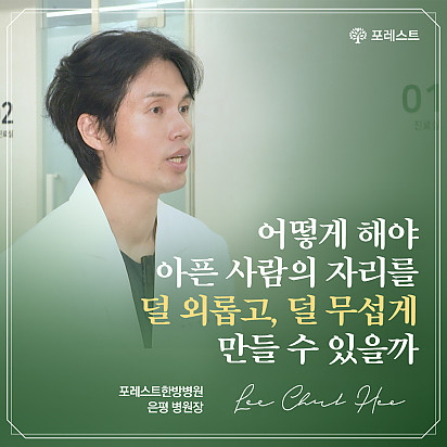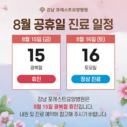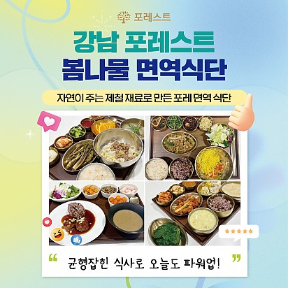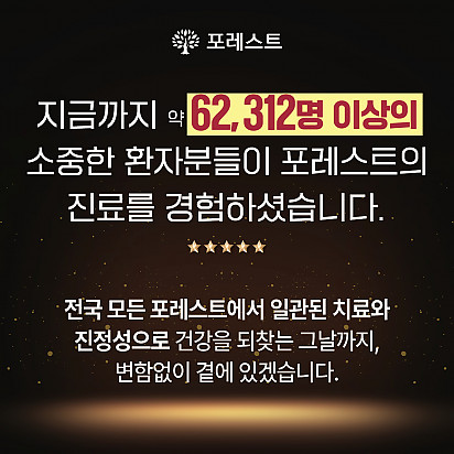 Hot 강남 포레스트요양병원에서 실제로 제공되는 식단 강남 포레스트요양병원에서 실제로 제공되는 암 환자 식단을 담았습니다. 균형 잡힌 영양소와 소화에 … 2025.08.26 Hot 은평 포레스트 병원장의 마음속 이야기 ”어떻게 해야 아픈 사람의 자리를 덜 외롭고,덜 무섭게 만들 수 있을까?“은평 포레스트 한방병원 이철희 병원장은이 질문을 매일… 2025.08.14 Hot 포레스트 8월 광복절 휴진 안내 [ 포레스트 8월 광복절 휴진 안내 ] 2025년 8월 15일 (금) 강남 포레스트는 광복절 휴진입니다. 진료 및 내원 … 2025.08.07 Hot 이 보라색이 면역력을 살립니다?! 가지에 숨겨진 힘 보라색 채소의 대표 주자, 가지! 그냥 먹으면 손해?! 암 예방에 도움을 줄 수 있는 '파이토케미컬'의 비밀과 가… 2025.07.24 Hot 초복을 담은 포레스트의 여름 밥상 안녕하세요, 포레스트입니다♥ 초복, 여름의 시작을 맞아 정성 가득한 보양식을 준비했습니다. 지친 몸에 활력을, 떨어진… 2025.07.22 Hot 힐링미에서 인정받은 포레스트 입원후기 암 요양병원 상담 앱 힐링미에서 인정받은 포레스트 입원후기를 소개합니다. 환자 한 분, 한 분의 상황에 맞춘 맞춤 치료… 2025.07.01 Hot 이달의 포레스트 얼굴을 소개합니다! 의료의 중심엔, 사람이 있습니다. 이달의 포레스트 얼굴을 소개합니다. 포레스트는 ‘사람 중심’의 의료를 실천합니다. … 2025.06.24 Hot 포레스트, 늘 곁에 있는 치료의 이름 안녕하세요 포레스트입니다. 지금까지 약 62,312명 이상의 소중한 환자분들이 포레스트의 진료를 경험하셨습니다. 전국 모… 2025.06.02 Hot 강남 포레스트 봄나물 면역식단 [강남 포레스트 봄나물 면역식단을 소개합니다] 자연이 선물한 식재료로 정성껏 준비한 한 끼, 기분 좋은 포만감과 활력을 더해… 2025.05.20 12345 Search 검색대상 제목 내용 제목+내용 회원아이디 회원아이디(코) 글쓴이 글쓴이(코) 검색어 필수
