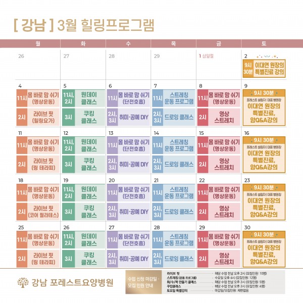 3월 힐링프로그램 포레스트의 3월 힐링프로그램을 소개합니다 :)♡ 삼일절의 기운과 시작하는 3월! 환우분들을 위해서 더욱 다양한 프로그램으로 돌아온 포레스트입니다 :)! ☆ 강남점에서 매주 토요일 특별진료와 암Q&A 시간이 새로 편성되었으니 많은 관심 부탁드립니다~ 언제나 환우분들의 몸과 마음의 힐링을 위하여 생각하고 연구하는 포레스트입니다♡ 목록