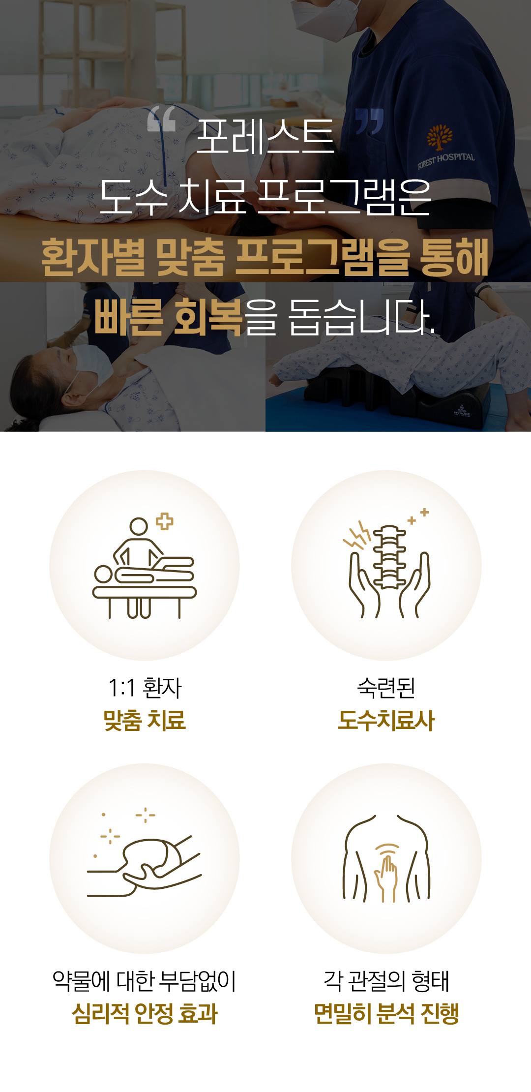 도수·물리·재활치료 수술 및 암종양에 의한 통증을 완화에 도움이 되는 도수·물리·재활치료 오랜 병상활동으로 신체활동 저하, 항암 후 근골격계 기능 저하 등 치료 전 후 다양한 후유증 치료에 도움. 체력 및 기력 저하를 해결하는데 탁월한 효과있음 도수치료는 약물을 사용하지 않는 비침습적 치료로 환자분들의 신체적 부담이 적음 도수·물리·재활치료의 장점 림프도수치료 치료사의 손에 의해 림프순환을 촉진하여 항암 관련 부작용이나 수술 후 림프절 손상으로 인해 생기는 림프순환 장애와 림프액의 축적으로 인한 부종과 통증을 치료 치료효과 림프절 혹은 림프관이 손상된 경우에도 경로를 우회하여 림프액을 흡수하고 부종 예방 교감신경의 진정 효과로 긴장완화와 림프 순환을 촉진 관문조절설에 의해 뇌로 전달하는 통증을 차단하여 통증을 경감 림프순환의 촉진으로 림프절 내의 면역세포가 활성화 정형도수치료 항암 집중 치료 후 생기는 근골격계 통증과 관절의 강직 및 운동 제한, 근육의 경직 및 단축 등 다양한 근골격계 후유증을 치료 치료효과 수술 후 유착된 결합조직이 분해, 분리되어 부드러운 상태로 복구 제한된 가동범위를 증가 시키고 근육을 강화시켜 편안한 움직임 촉진 통증이 감소되고 근육 긴장도를 낮춤 내장기도수치료 내장기 안의 내용물을 움직이고 순환시키고 내장기 주변의 긴장과 유착을 풀어주어 항암 집중 치료 후 생기는 소화불량, 복부 팽만감, 변비, 설사 등 위장장애를 치료 치료효과 수술 후 유착된 내장기 주변을 풀어주어 부드러운 정상기능 상태로 회복 소화불량, 변비 등 위장장애를 해소 운동치료 신체를 움직여 심폐기능 활성화시켜 근력 상승과 피로회복에 도움 신체 활동량을 높여 체력 향상을 이끌며 면역력 상승 효과 치료효과 뻣뻣한 근막을 신장시켜 림프순환을 촉진, 부교감 활성을 유도하여 회복에 도움 전체적인 신진대사를 촉진 예민한 감각을 줄여주어 통증 감소와 운동성 회복에 도움 물리치료 장비 PAIN JAMMER ENS-1140 | 비침습 통증 치료기 피부에 부착한 전극을 통해 뇌로 전달되는 통증 전달 경로를 무통증 신호로 바꿔주는 기구 적외선 치료기 열을 발생시켜 몸 안으로 침투하여 근육의 긴장을 풀고 혈액순환에 도움을 주는 치료장비 TENS | 경피신경자극기 통증 부위에 있는 감각 신경에 물리적 자극을 일정한 간격으로 줌으로써 뇌로 가는 통증 신호를조절해 통증을 줄이는 치료장비