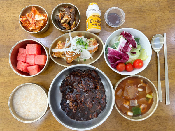 구운가지무침/ 요구르트/ 김치/ 계절샐러드/ 수박