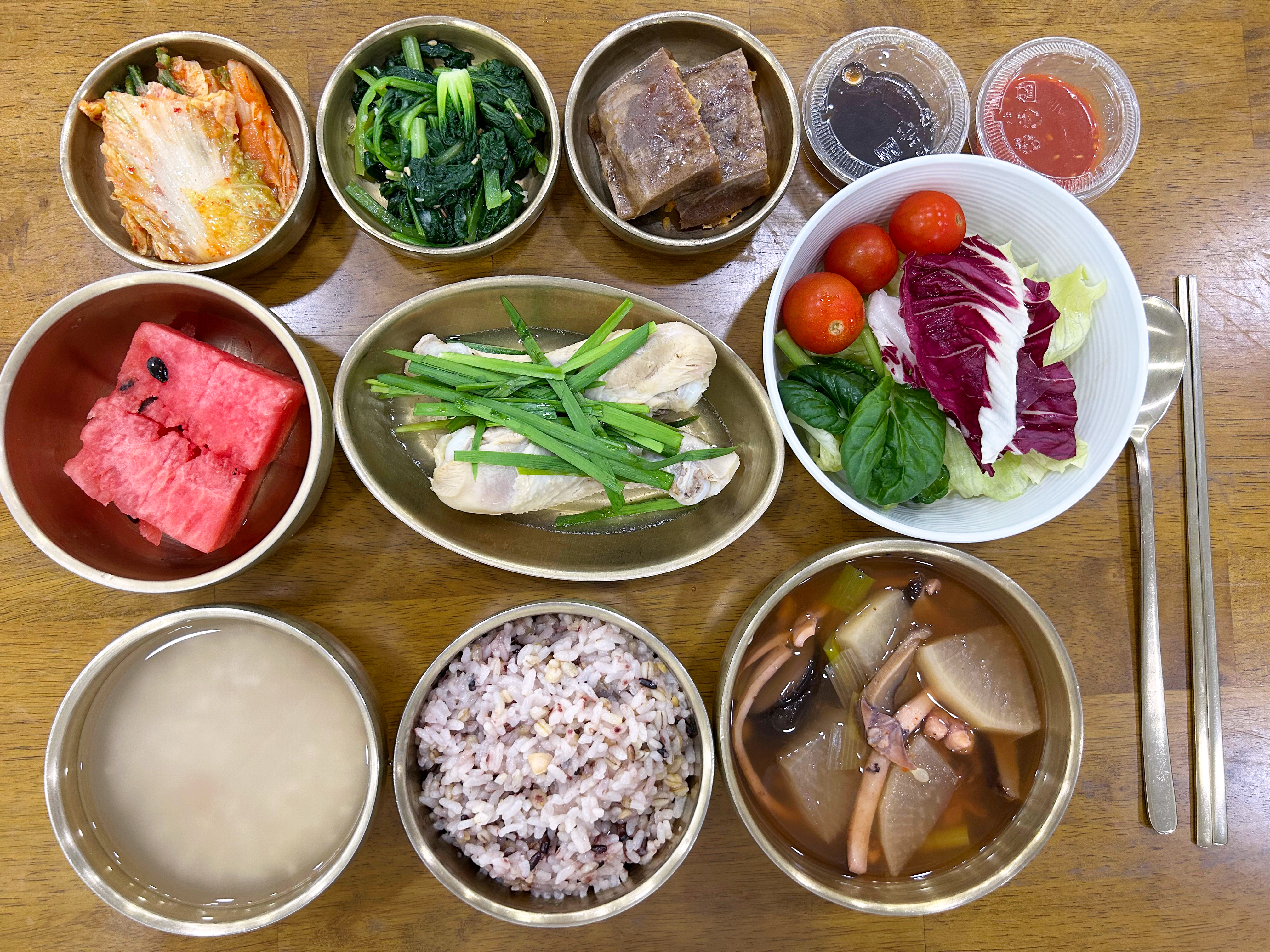 잡곡밥/ 누룽지/ 오징어무국/ 닭수육&겨자초장/