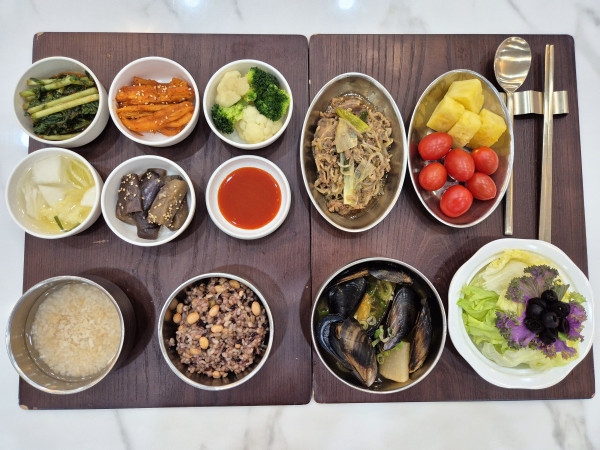잡곡밥/누룽지/얼큰홍합탕/우삼겹숙주볶음/