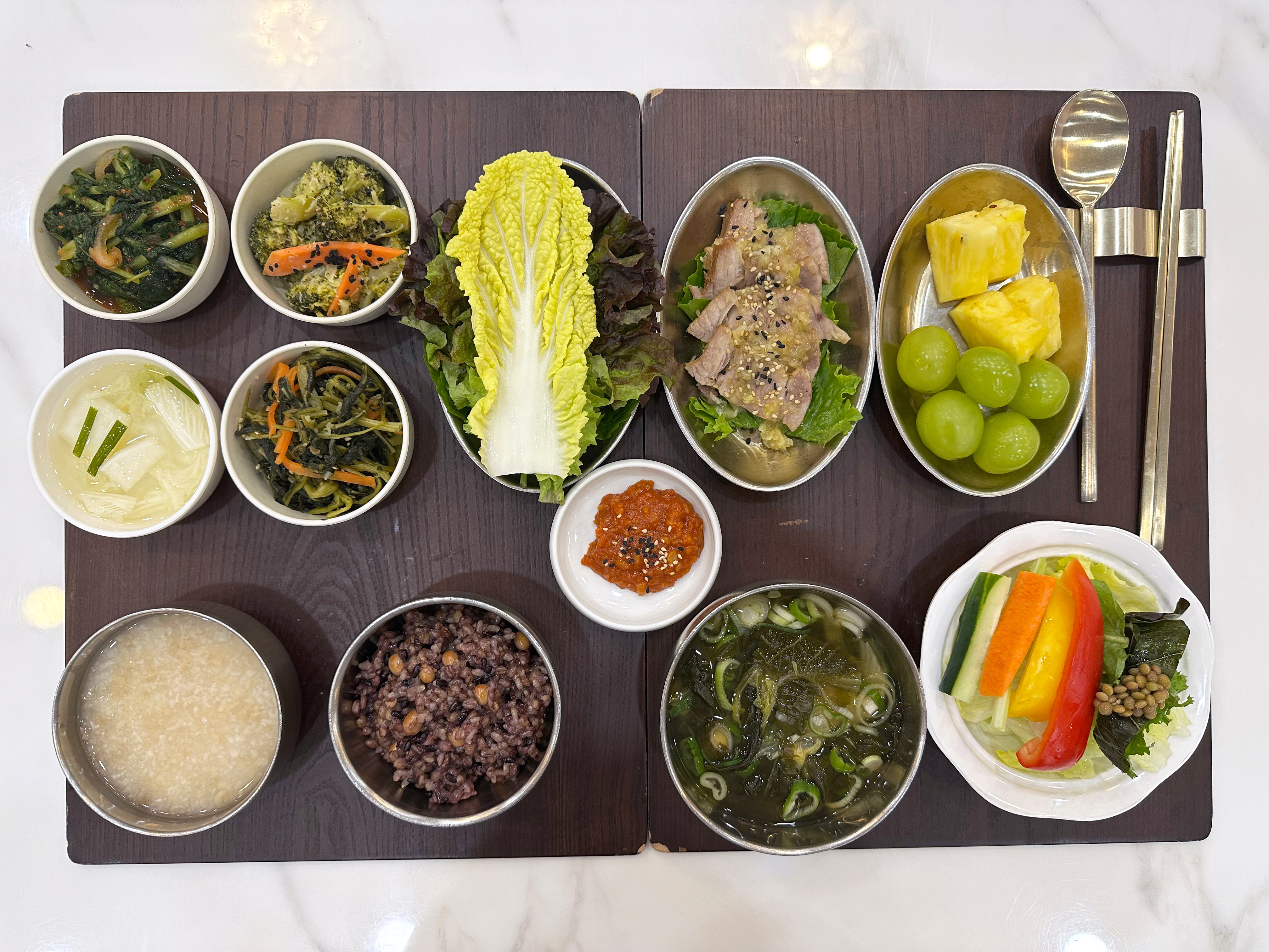 잡곡밥/누룽지/얼갈이된장국/마늘보쌈&쌈채소,숙채/