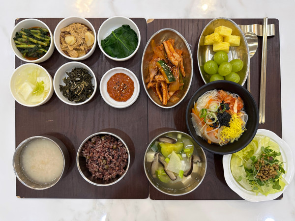 1월 9일 항암식단 [1/9 금요일 중식] 잡곡밥/누룽지/새우젓국찌개/오징어볶음/ 닭안심장조림/아주까리나물/잔치국수(라이브)/ 케일숙쌈/김치&물김치/계절샐러드/파인애플&샤인머스켓 목록
