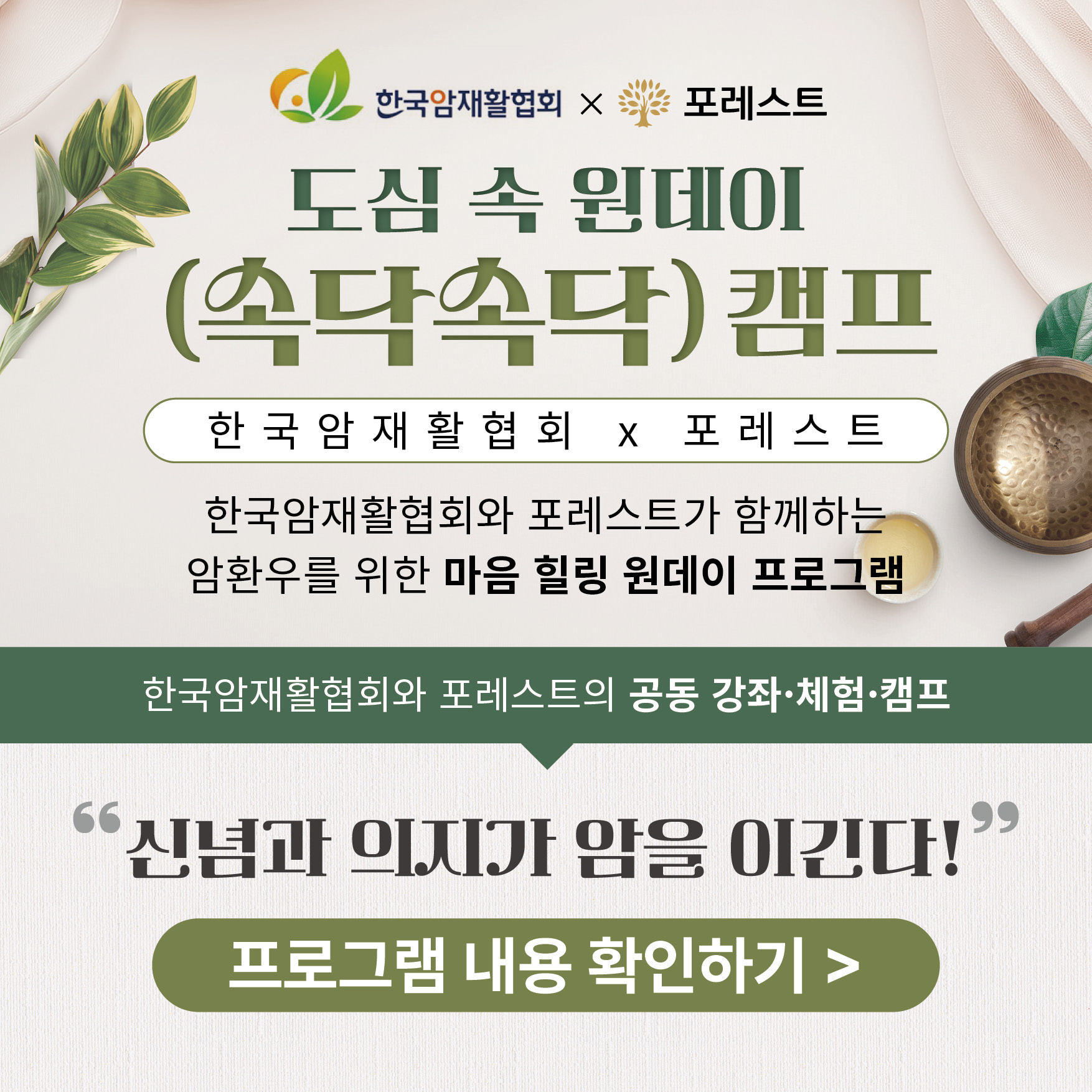 암환우 힐링 프로그램 ‘속닥속닥 캠프’ OPEN! 한국암재활협회 × 포레스트 암환우 힐링 프로그램 ‘속닥속닥 캠프’ OPEN! 암 치료 과정에서 지친 마음을 회복할 수 있도록 포레스트 강동에서 원데이 힐링 프로그램을 진행하고 있습니다. 하루 동안 몸과 마음을 깊이 어루만지는 시간, 속닥속닥 캠프에서 회복의 에너지를 느껴보세요. ✅ 문의 전화 : 포레스트 1899-5868 ✅ 홈페이지 : foresthospital.co.kr ✅ 유튜브 : ‘포레스트병원’ 검색 목록