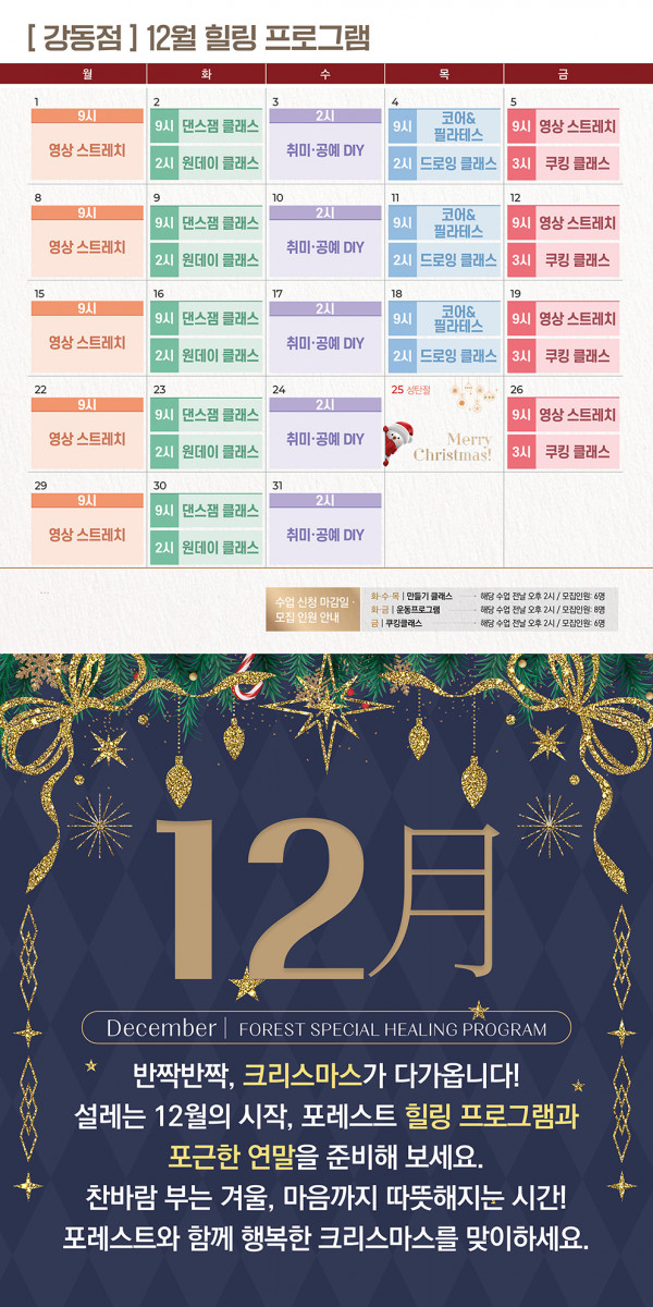 12월 강동 포레스트 힐링프로그램 12월 포레스트 힐링프로그램을 소개합니다. 반짝이는 12월, 크리스마스의 기쁨이 가까워지고 있습니다. 차가운 겨울바람 속에서도 마음이 따뜻해질 수 있도록 포레스트가 다양한 힐링 프로그램을 준비했습니다. 포근한 연말을 채워줄 작은 쉼표, 12월의 따뜻함을 함께 느껴보세요. 여러분의 많은 관심과 참여 부탁드립니다. ✅ 문의 전화 : 포레스트 1899-5868 ✅ 홈페이지 : foresthospital.co.kr ✅ 유튜브 : ‘포레스트병원’ 검색 목록