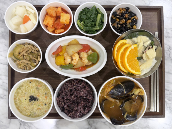 전복죽 / 잡곡밥 / 짬뽕국 / 굴소스새우볶음 /