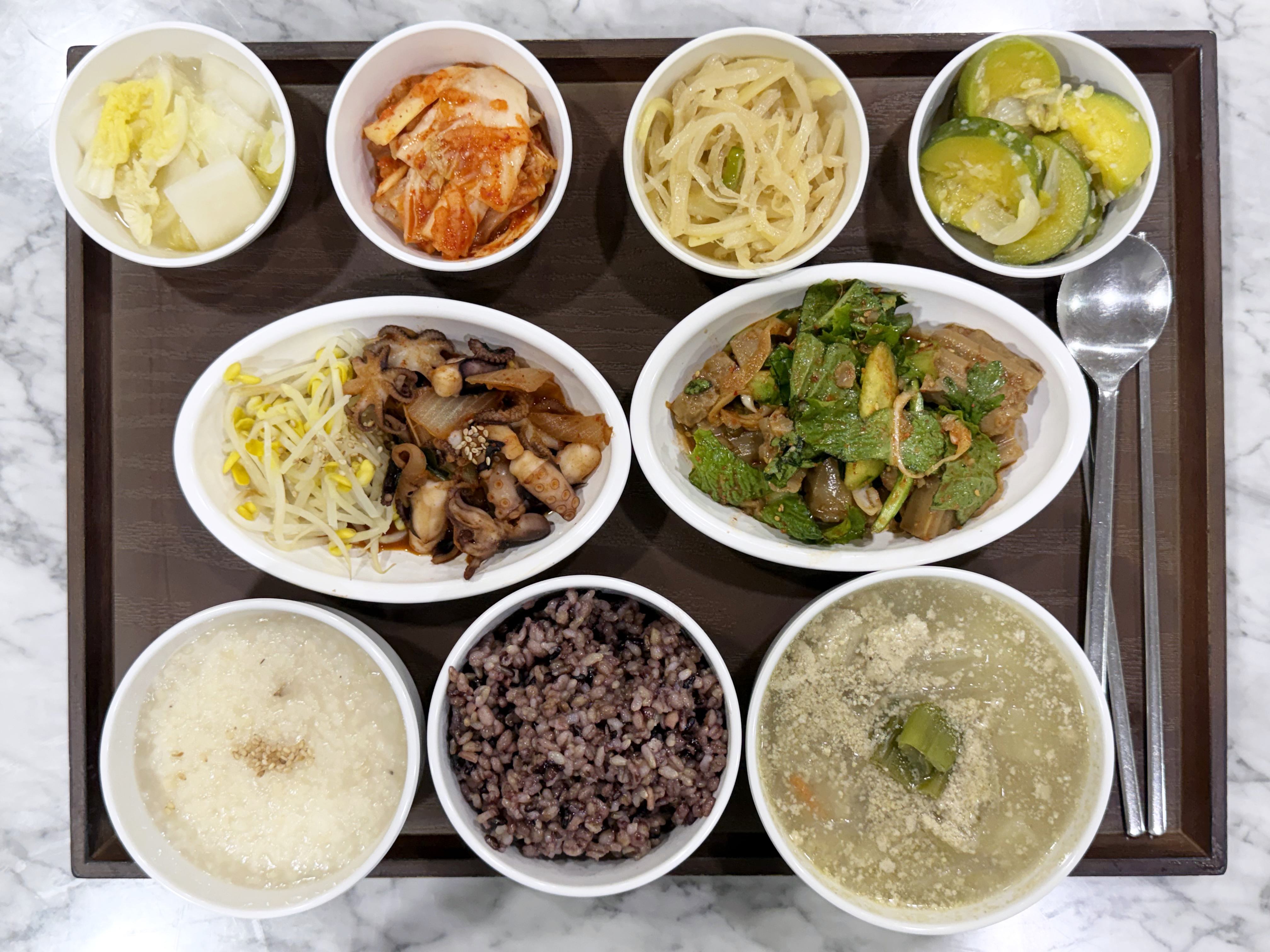 11월 26일 항암식단 [11/26 수요일 중식] 버섯죽 / 잡곡밥/ 들깨감자국 / 쭈낙볶음&콩나물사리 / 도토리묵야채무침 / 새우젓애호박조림 / 도라지나물 / 김치&물김치/ 계절샐러드 목록