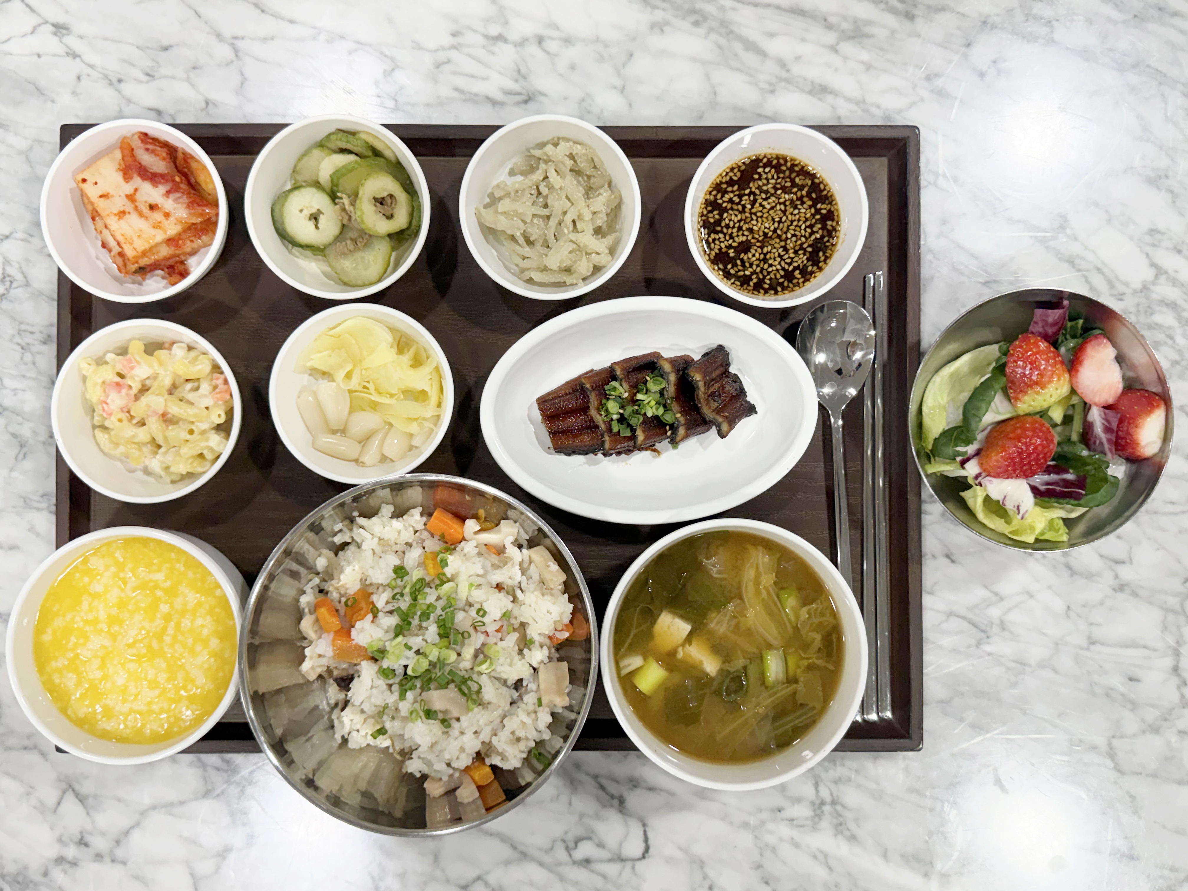 단호박죽 / 잡곡밥 / 봄동된장국 / 장어구이&락교 /