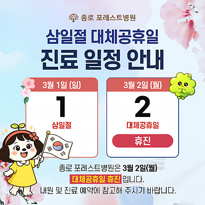 포레스트 삼일절 대체공휴일 진료 안내  포레스트 삼일절 대체공휴일 진료 안내   안녕하세요, 포레스트입니다 삼일절 대체공휴일 진료(휴진) 일… 2026.02.24